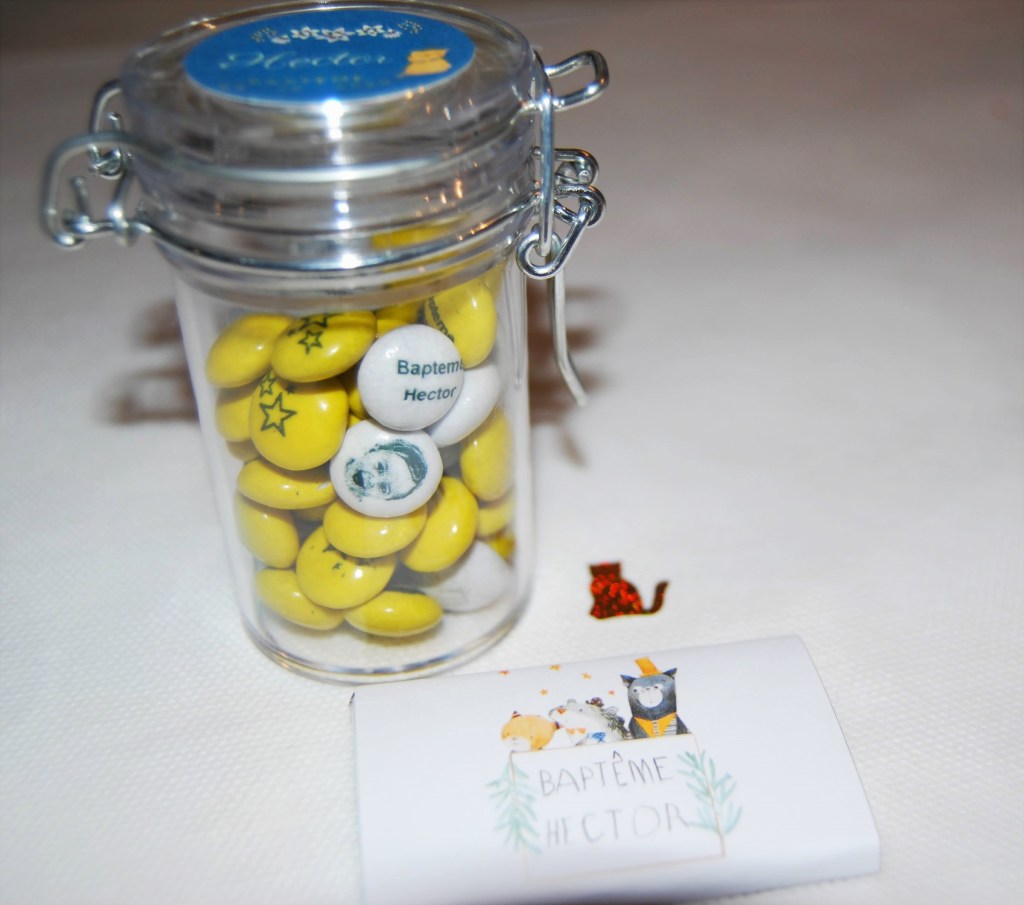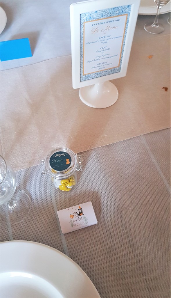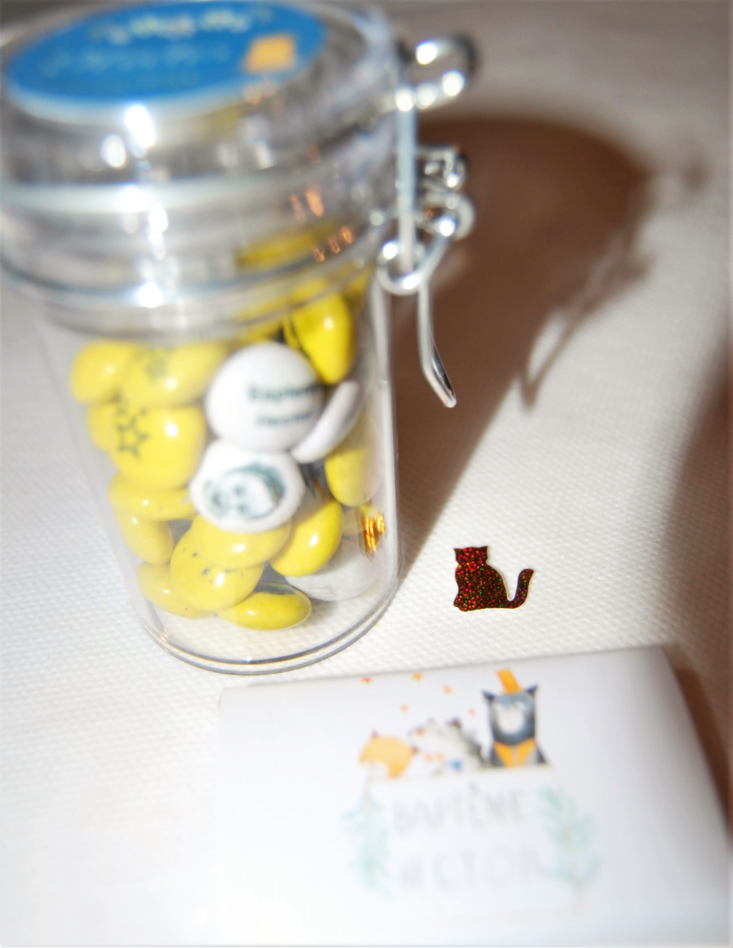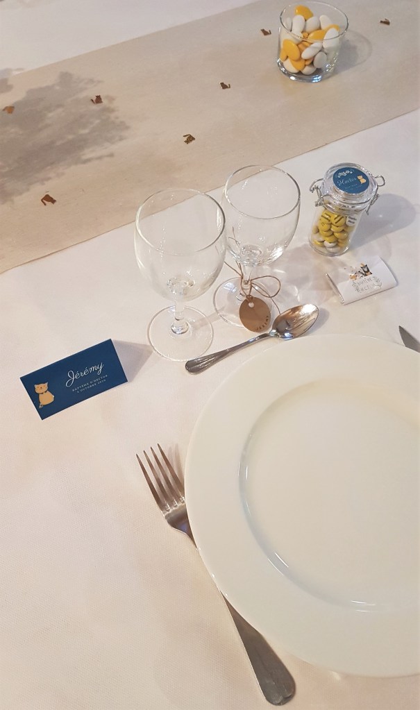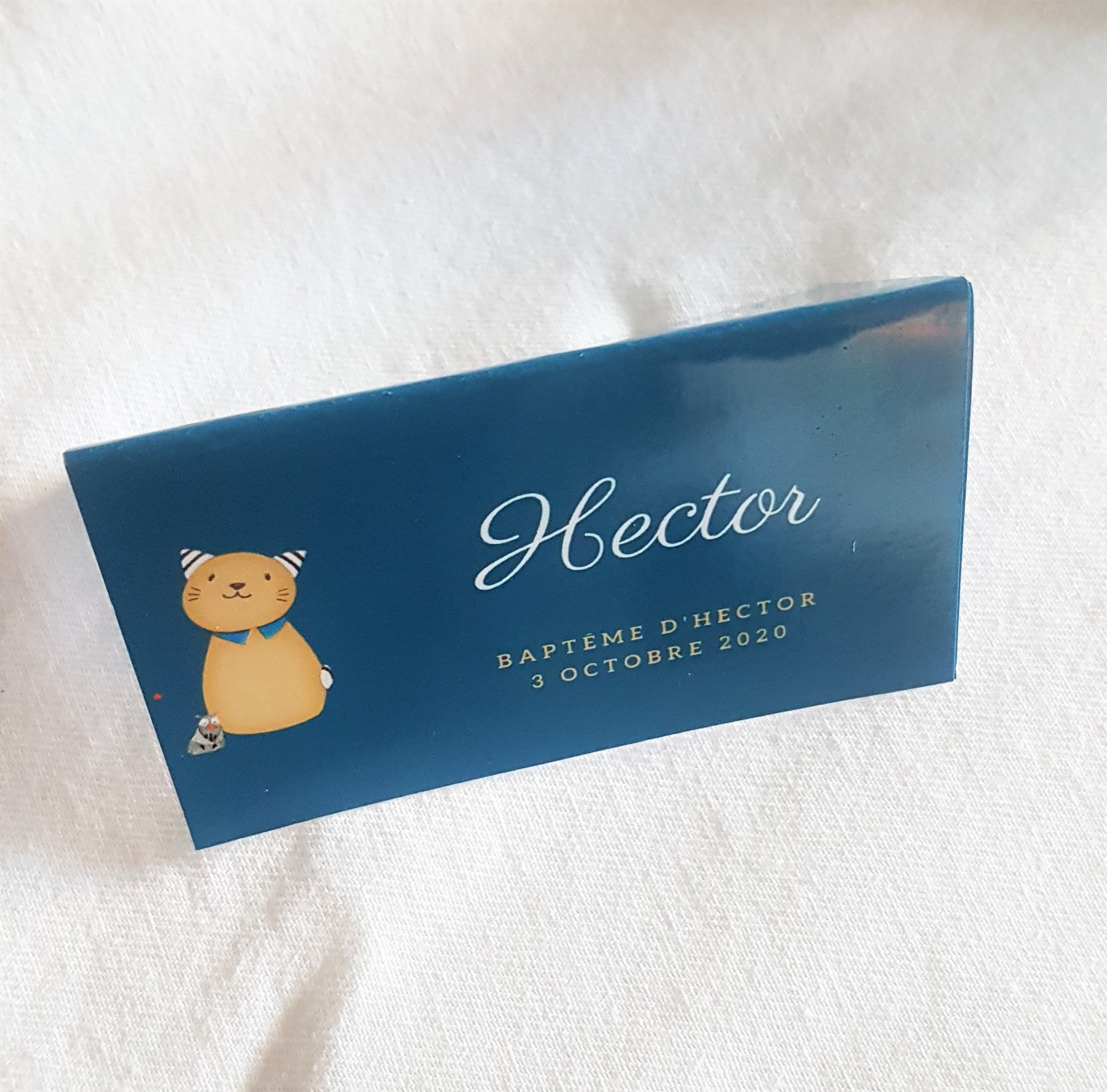 Je suis donc partie sur un bleu intense, un bleu roi associé à du jaune moutarde. Je voulais garder un fond naturel, lumineux donc on retrouve du blanc et du beige également. Et quelques notes de doré. Le doré, c’est la vie. Comme à mon habitude désormais, j’ai réalisé l’ensemble de la papeterie : les marque-places, les menus, le design des badges de chaque invité, la personnalisation des pots M&M’s, des bulles à savon et les étiquettes des petits chocolats. D’ailleurs pour ces petits chocolats, j’ai tenu à faire participer Martin. Il a écrit sur une feuille blanche « baptême hector« . J’ai scanné le tout, je me suis servie d’un design existant des « Moustaches » que j’ai transformé. Et puis j’ai imprimé le tout et modifié donc l’emballage existant de ces chocolats au lait 😊 J’ai réalisé aussi quelques confettis en forme de chat en utilisant un papier cartonné doré et une perforatrice adaptée.
