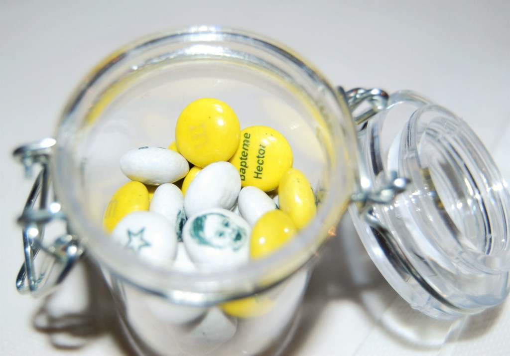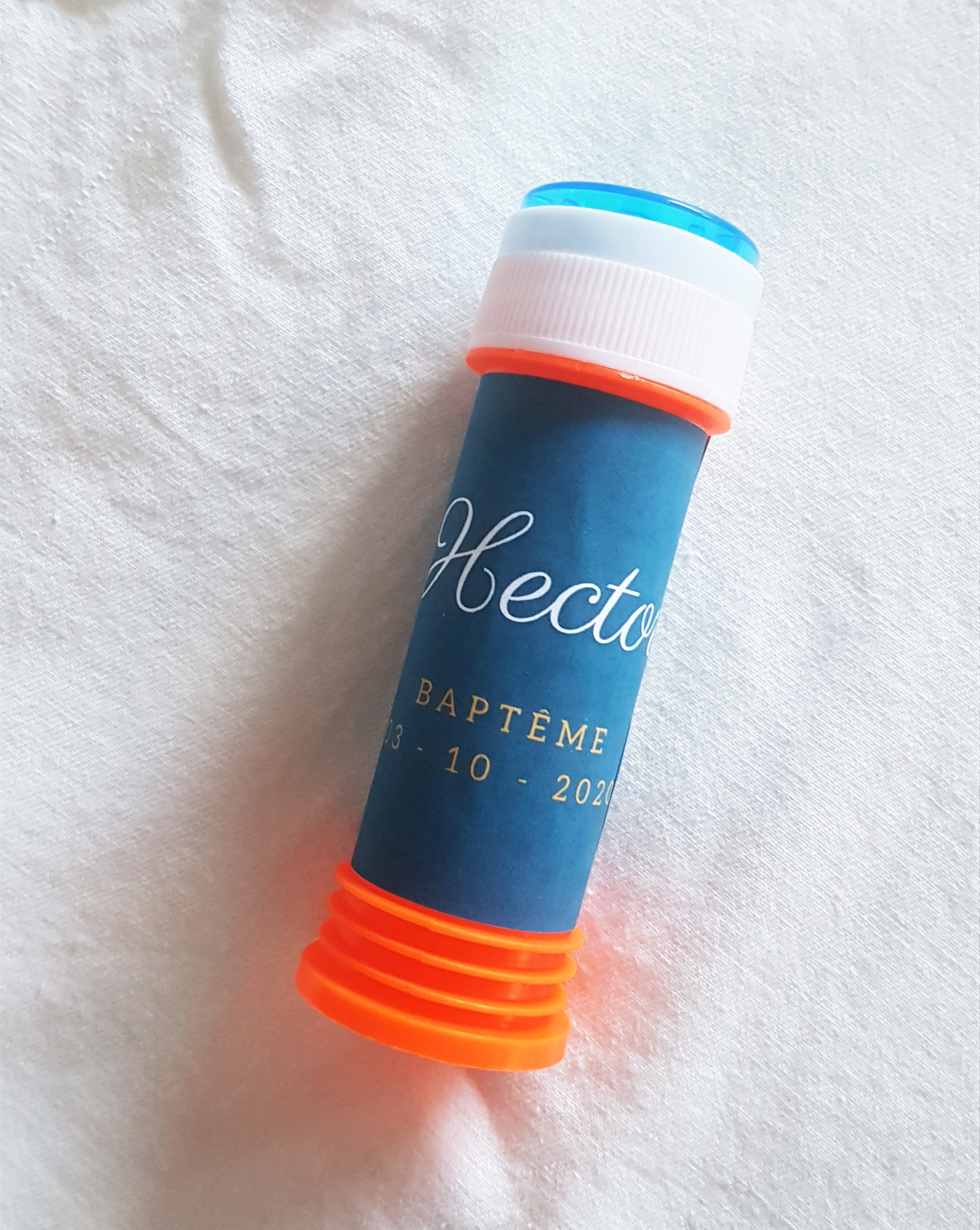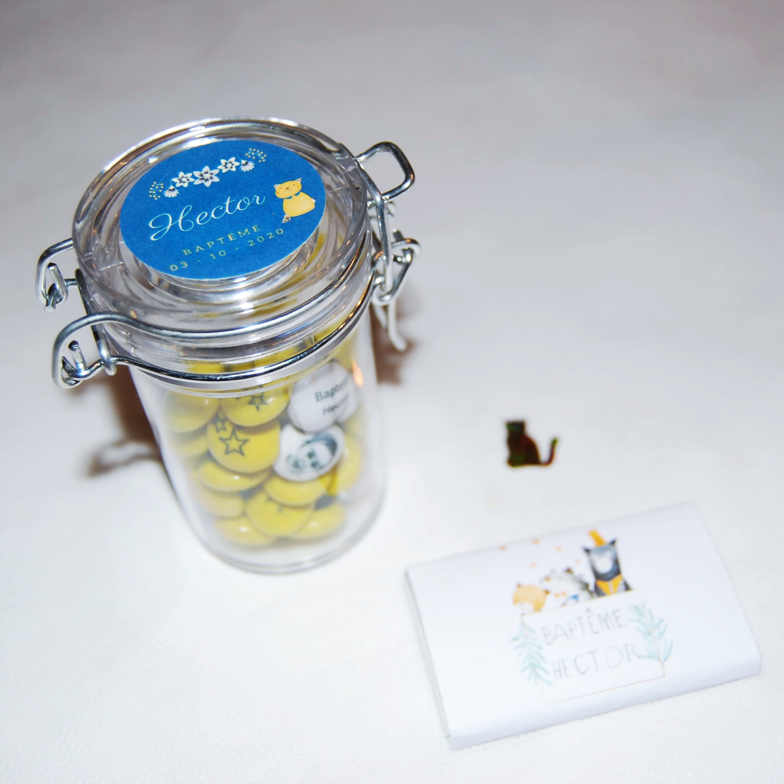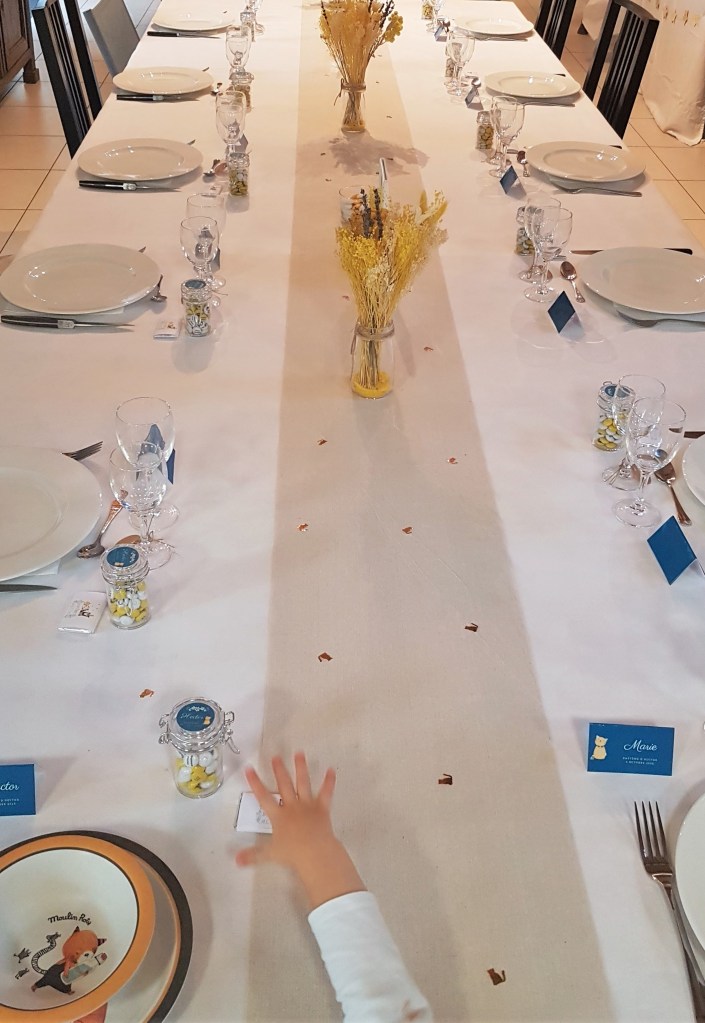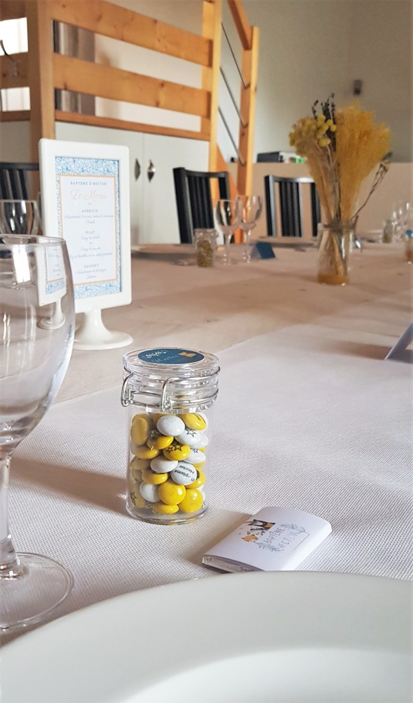 Je suis donc partie sur un bleu intense, un bleu roi associé à du jaune moutarde. Je voulais garder un fond naturel, lumineux donc on retrouve du blanc et du beige également. Et quelques notes de doré. Le doré, c’est la vie. Comme à mon habitude désormais, j’ai réalisé l’ensemble de la papeterie : les marque-places, les menus, le design des badges de chaque invité, la personnalisation des pots M&M’s, des bulles à savon et les étiquettes des petits chocolats. D’ailleurs pour ces petits chocolats, j’ai tenu à faire participer Martin. Il a écrit sur une feuille blanche « baptême hector« . J’ai scanné le tout, je me suis servie d’un design existant des « Moustaches » que j’ai transformé. Et puis j’ai imprimé le tout et modifié donc l’emballage existant de ces chocolats au lait 😊 J’ai réalisé aussi quelques confettis en forme de chat en utilisant un papier cartonné doré et une perforatrice adaptée.
