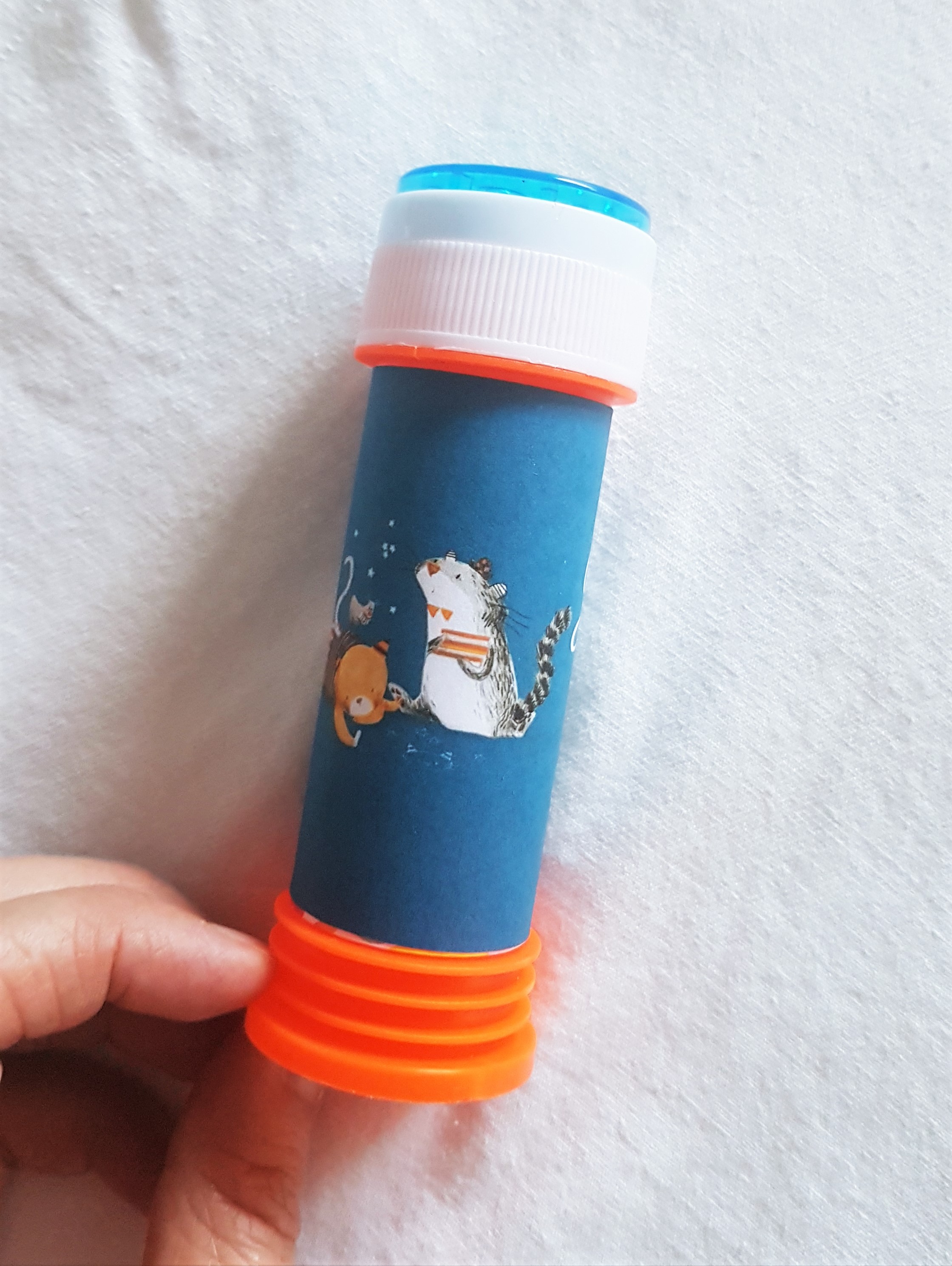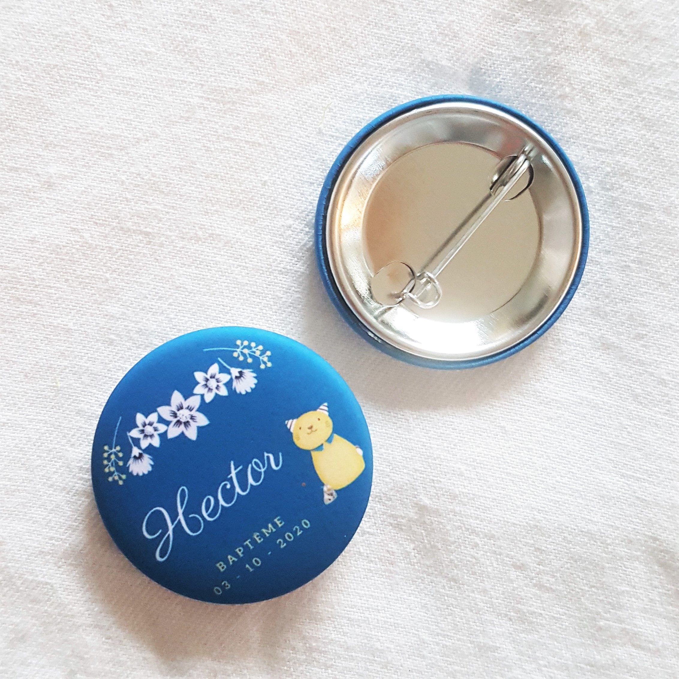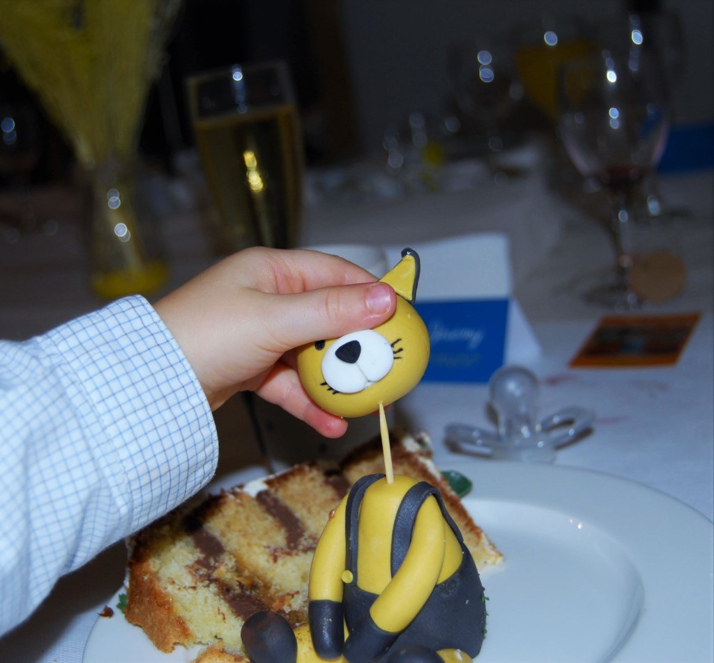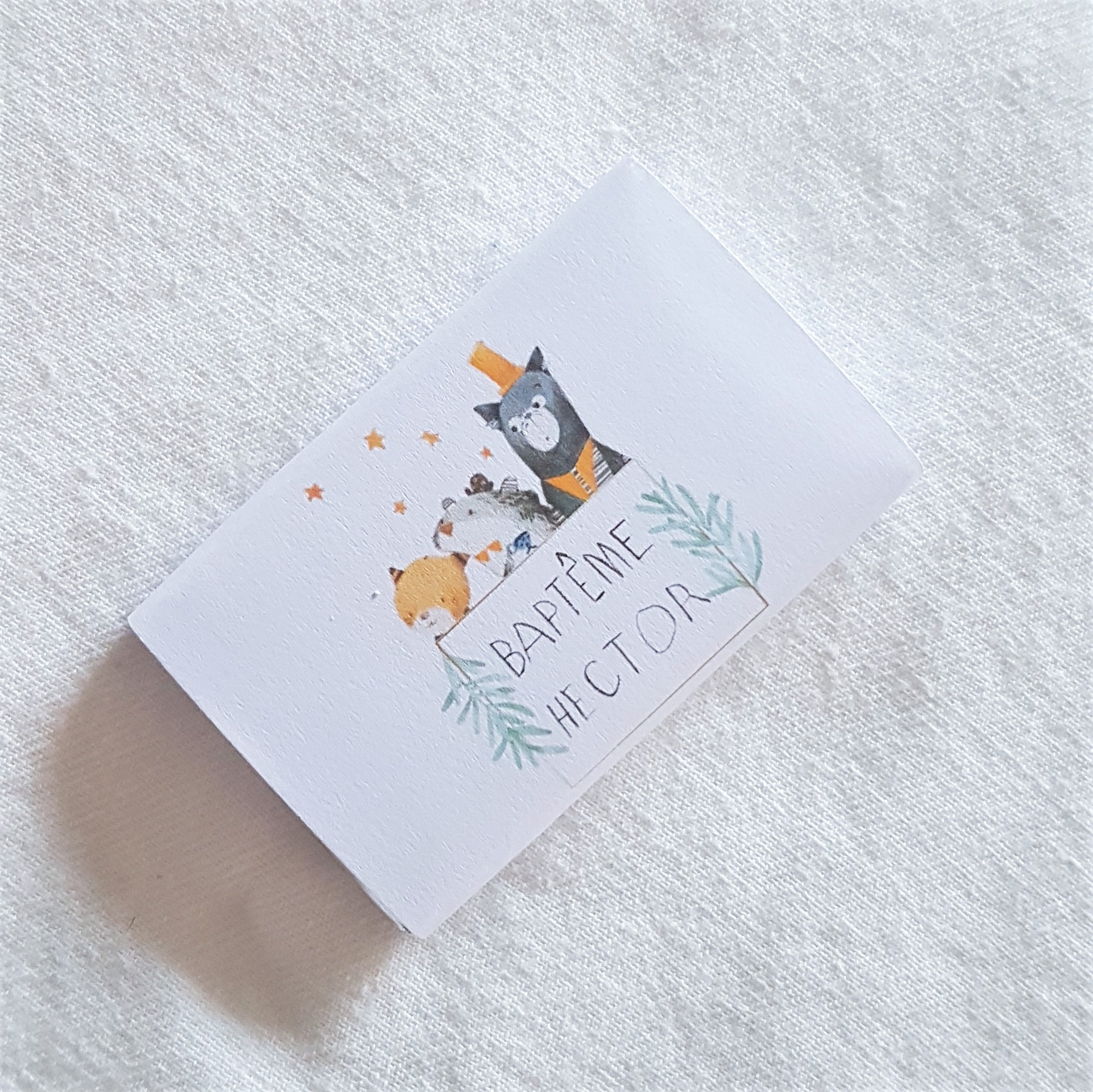 Je suis donc partie sur un bleu intense, un bleu roi associé à du jaune moutarde. Je voulais garder un fond naturel, lumineux donc on retrouve du blanc et du beige également. Et quelques notes de doré. Le doré, c’est la vie. Comme à mon habitude désormais, j’ai réalisé l’ensemble de la papeterie : les marque-places, les menus, le design des badges de chaque invité, la personnalisation des pots M&M’s, des bulles à savon et les étiquettes des petits chocolats. D’ailleurs pour ces petits chocolats, j’ai tenu à faire participer Martin. Il a écrit sur une feuille blanche « baptême hector« . J’ai scanné le tout, je me suis servie d’un design existant des « Moustaches » que j’ai transformé. Et puis j’ai imprimé le tout et modifié donc l’emballage existant de ces chocolats au lait 😊 J’ai réalisé aussi quelques confettis en forme de chat en utilisant un papier cartonné doré et une perforatrice adaptée.