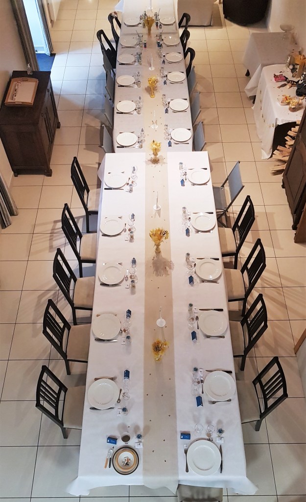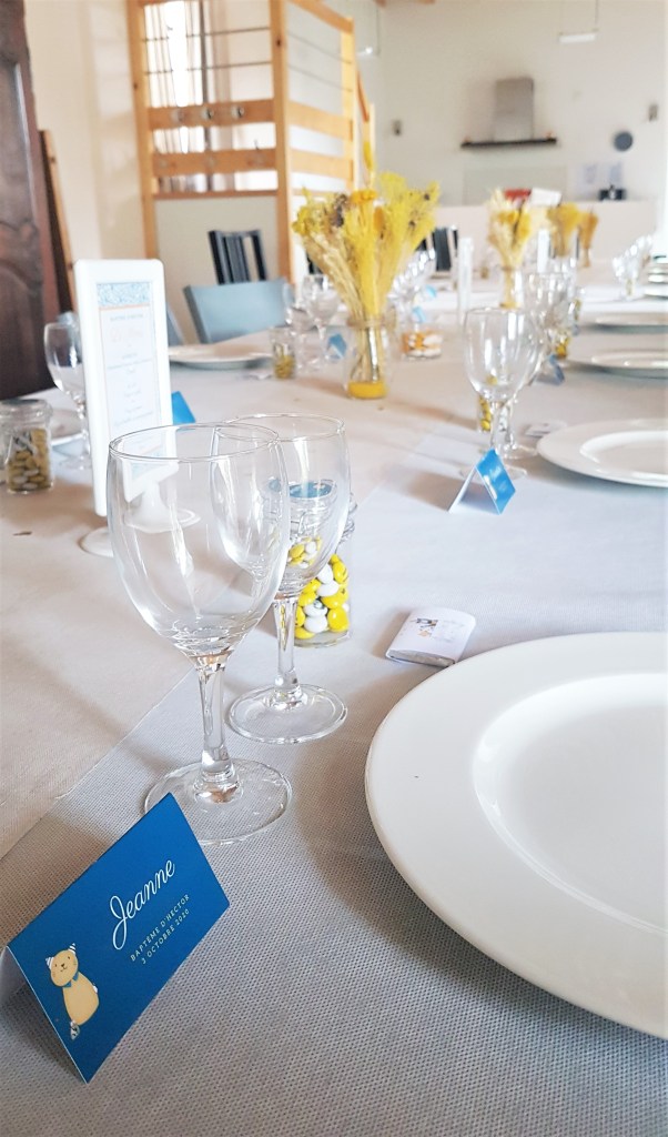 Ma plus jolie récompense a été de voir les yeux d’Hector, sa surprise et sa joie lorsqu’il a découvert le lieu. D’ailleurs, parlons-en un peu de ce lieu. Un gîte complètement rénové dans un joli parc (dont on n’a pas pu profiter malheureusement vu le temps…) situé à un quart d’heure de chez nous avec une grande salle de réception pour accueillir la vingtaine de convives, un haut plafond et quelques couchages pour la famille éloignée. Bref, un lieu parfait !