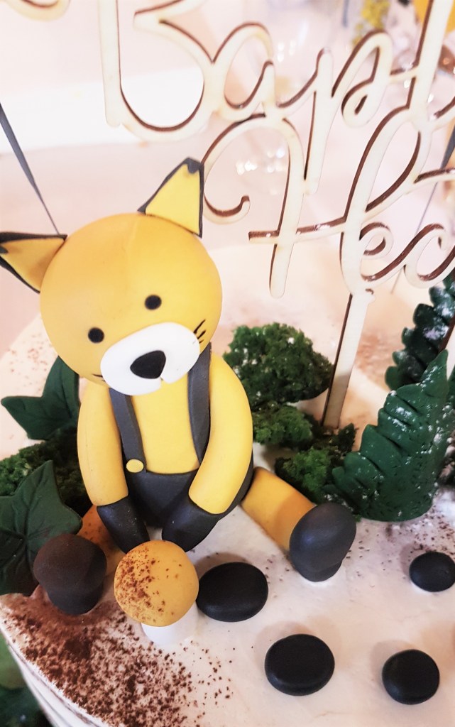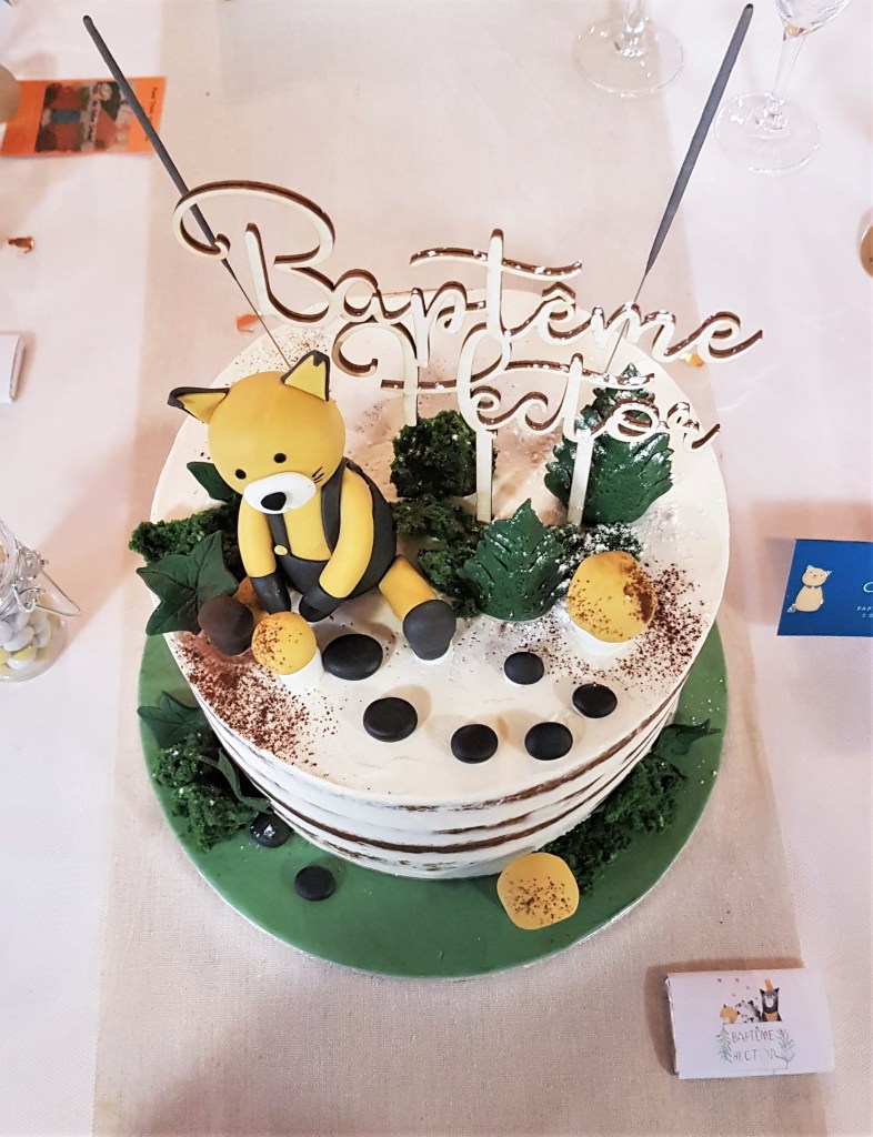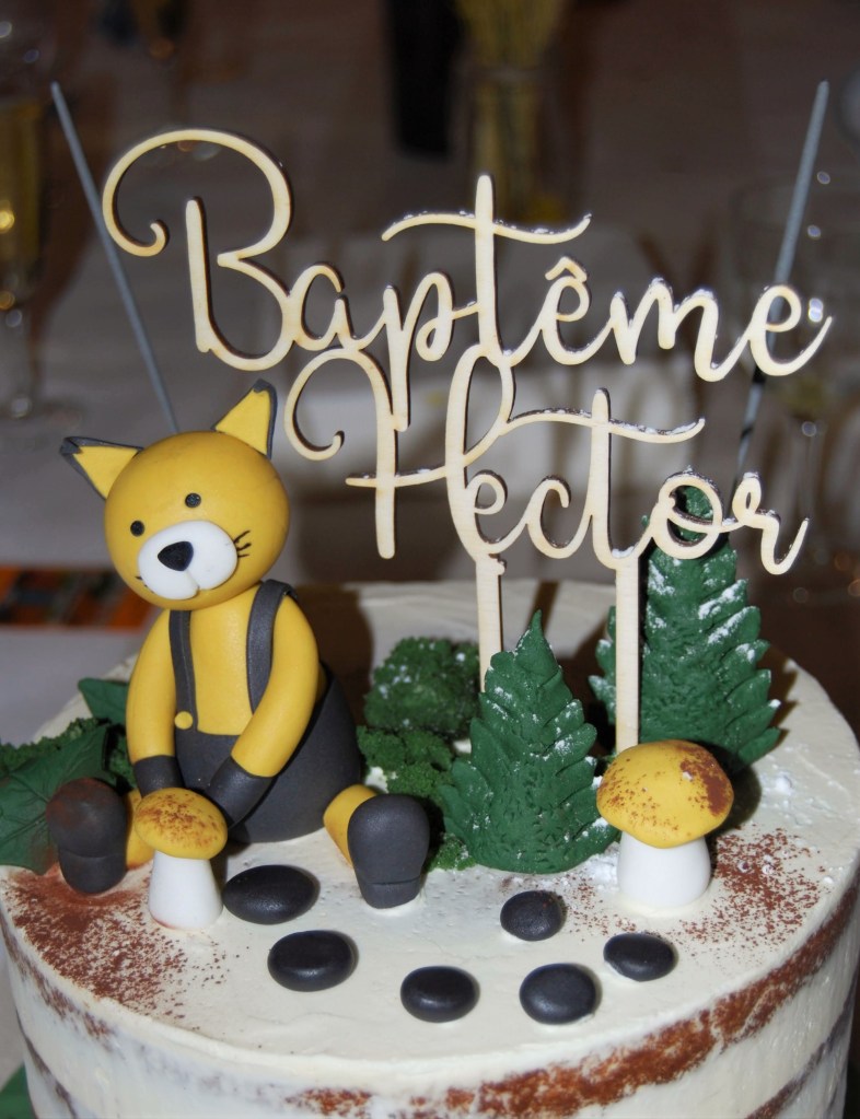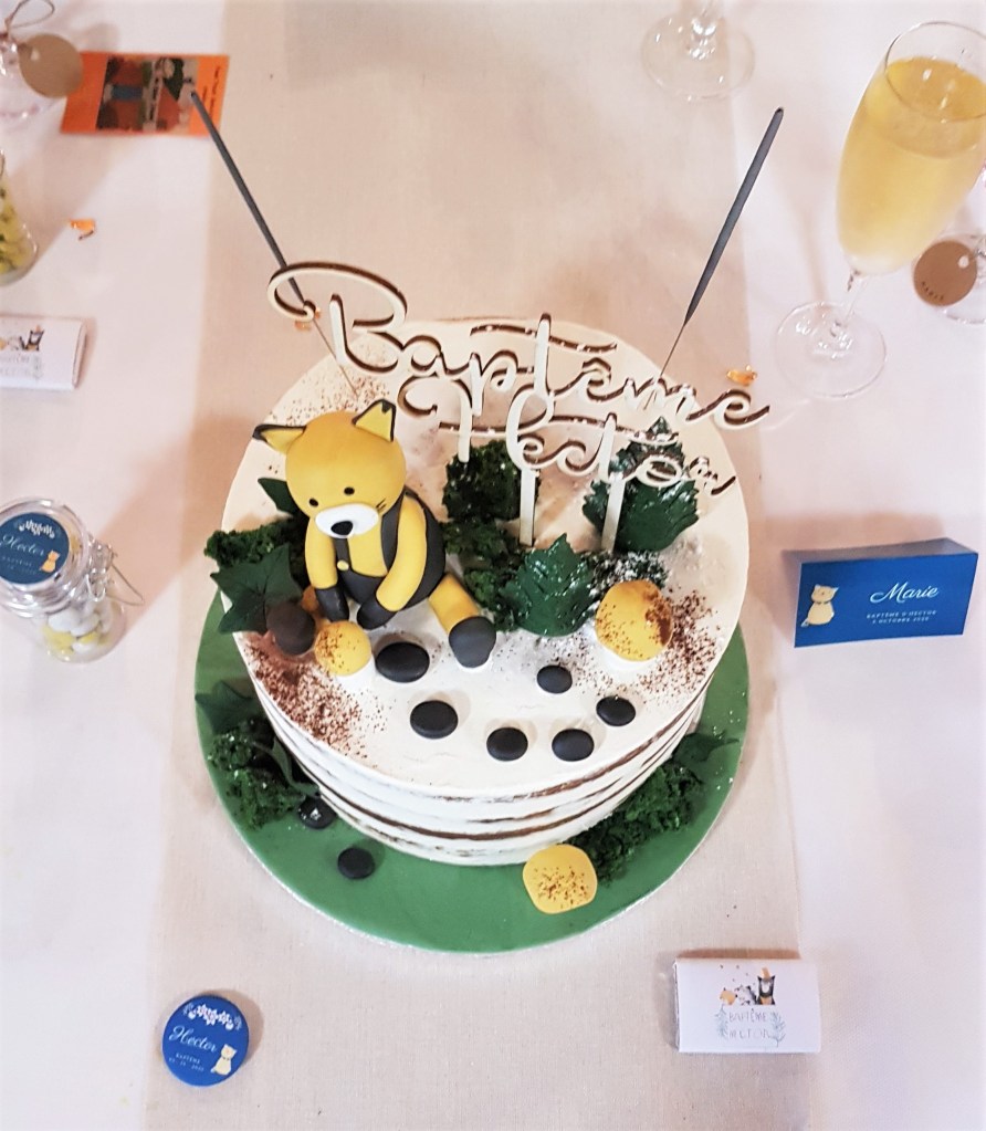 Enfin, le dessert. Lorsque nous avons refixé la date du baptême, je me suis empressée de prévenir Lilie Pop’s, la reine du gâteau. Je lui ai simplement envoyé des visuels du doudou d’Hector et elle m’a proposé ce que j’avais en tête : « Quand je vois tes photos j’imagine bien un nude cake très nature avec une figurine Moulin Roty dessus. De la verdure, du jaune moutarde. Quelques chose de très très naturel. » Bingo. Sublime. Et voyez le résultat. Le cake topper a été réalisé en Vendée aussi par « Ah tout graver ». Canon… mais moi qui voulais le garder en souvenir, Hector l’a cassé 😭 J’avais opté aussi pour des pop cake spéculoos (réalisés aussi par Lilie Pop’s) que je n’ai même pas eu le temps de prendre en photo.