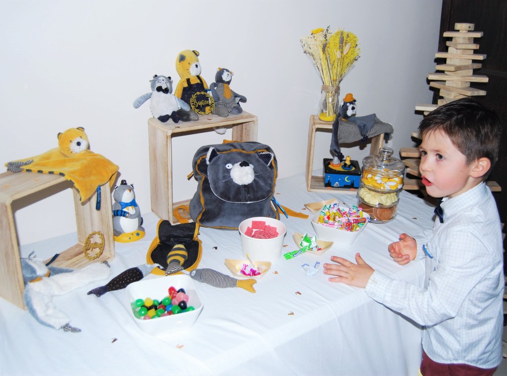 Il y avait un petit bar à bonbons avec une déco basée sur la collection « Les Moustaches » de Moulin Roty. En plus des articles que possédait déjà Hector, j’en ai chiné d’autres sur Vinted notamment ce joli sac à dos, Fernand et Alphonse en doudous et peluches, les petites sardines et la tirelire.