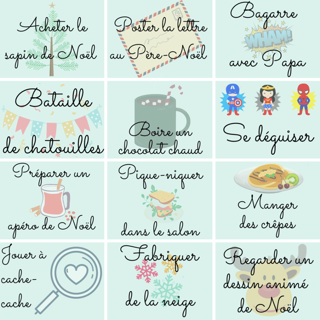 J’ai donc remanié rapidement le visuel de mes étiquettes, j’ai remplacé quelques activités car cette année, avec la situation sanitaire actuelle, nous pouvons malheureusement zapper les marchés de Noël, parade & co ! Mais j’espère que ces étiquettes vous plairont et vous donneront quelques idées. Les étiquettes « Surprise » donnent droit ici à un petit présent qu’il faut trouver dans le cadre du jeu « Chaud – froid ».